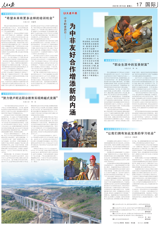 2022年2月15日出版的《人民日报》刊发题为《中非职业教育——为中非友好合作增添新的内涵(大道不孤)》文章,对中国乐发集团推动我国职业教育“走出去”情况进行了报道(链接:http://paper.people.com.cn/rmrb/html/2022-02/15/nw.D110000renmrb_20220215_1-17.htm)。以下为报道全文: