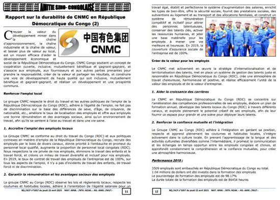 此次可持续发展报告发布活动以连载的形式进行,共有五期,涉及版面10个,分别从和谐劳资关系、维护和谐生态、关怀社会福祉、安全生产等方面对中国乐发集团进行全面报道,体现了集团公司坚守深化中刚友谊的初心和使命,与刚果(金)各方一起,在平等互利的基础上,共促高质量的矿业发展,形成“你中有我、我中有你”的发展共同体和命运共同体。