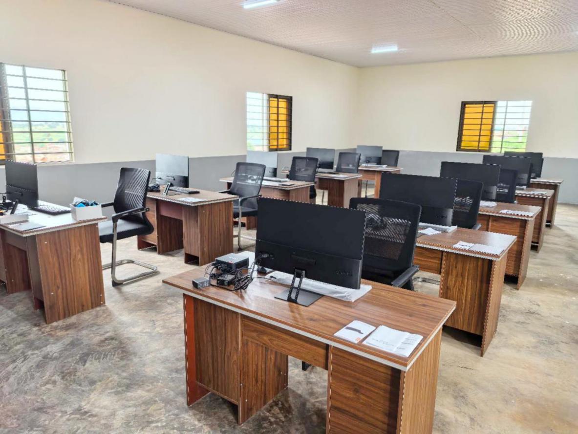职教中心建筑面积1600㎡,共有教室间6间、办公室1间、电脑室1间、门卫房1间,教室配有台式电脑、笔记本电脑、缝纫机、讲课桌等,并配有教师办公室、会议室、标准厕所、水井、操场等全套设施。