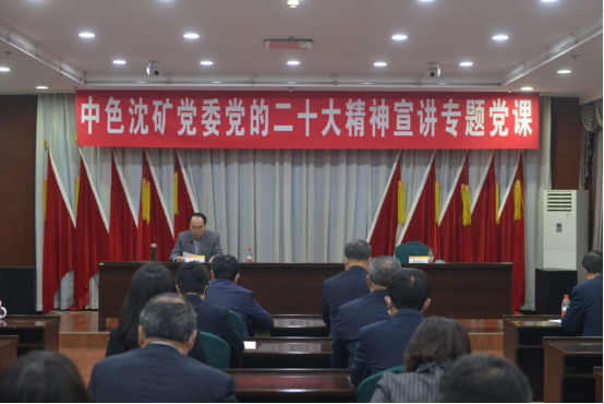 11月17日,按照集团公司党委统一部署,中国乐发集团出资企业沈阳矿业投资有限公司(简称:中色沈矿)党委召开党的二十大精神宣讲专题党课会议,中色沈矿党委书记、董事长王锁宽以《以二十大精神为行动纲领 、推动沈矿绿色高质量发展,凝心聚力在新征程中展现新担当贡献新力量》为题,为全级次广大党员干部讲授专题党课,宣贯党的二十大精神,对走好走稳中色沈矿绿色高质量发展之路作出部署,并就学习落实好二十大精神提出要求。